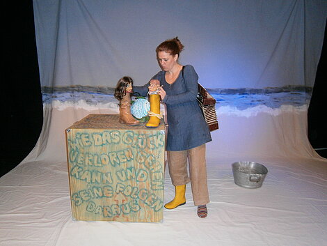 Nach einem Sturm liegt eine große Kiste am Strand – Strandgut!!! Herrenlos und unversehrt; nicht zu erkennen, woher sie kam und wohin sie soll; ganz verschwommen und kaum lesbar die Aufschrift „Wie das Glück verloren gehen kann und seine Folgen daraus“. Was hat da das Meer angespült? Jeder weiß, wer Strandgut findet, dem gehört es. Also – alles vorsichtig auspacken und sehen, was daraus entsteht: einzelne Sperrholzteile, zwei alte Stiefel, ein alter verbeulter Blechpißpott, eine Gießkanne wie ein Fisch geformt…? Glücklicherweise liegt eine Bauanleitung dabei und ein Zauberspruch: „Mantje, Mantje Timpe Te, Butje Butje in der See. Meine Frau, die Ilsebill, will nicht so, als ich wohl will.“